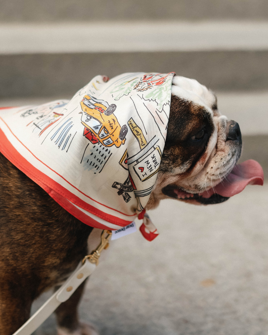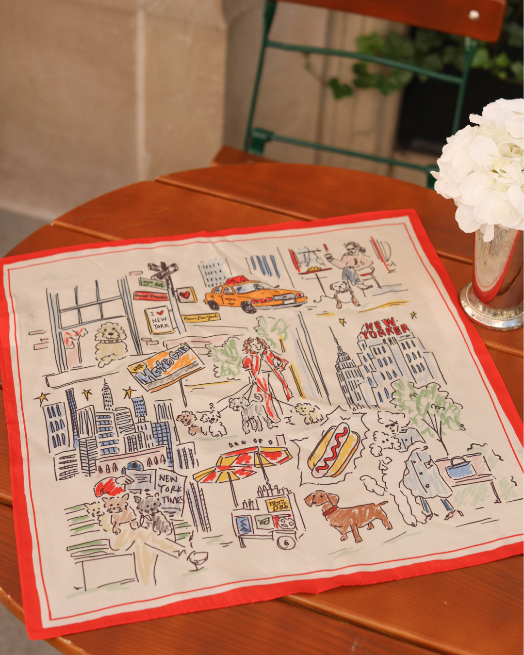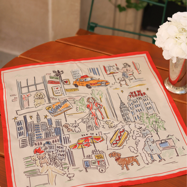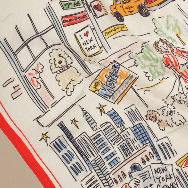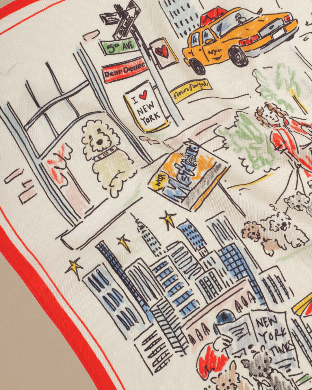 Illustrated by Noun New York, our silk scarf combines timeless architectural icons, classic city motifs like yellow taxi, storied street signs, and the ever-charming presence of city dogs. Subtle nods to the New York Times and other cultural touchstones lend a sense of heritage, while the composition captures the elegance and energy of a city in motion.