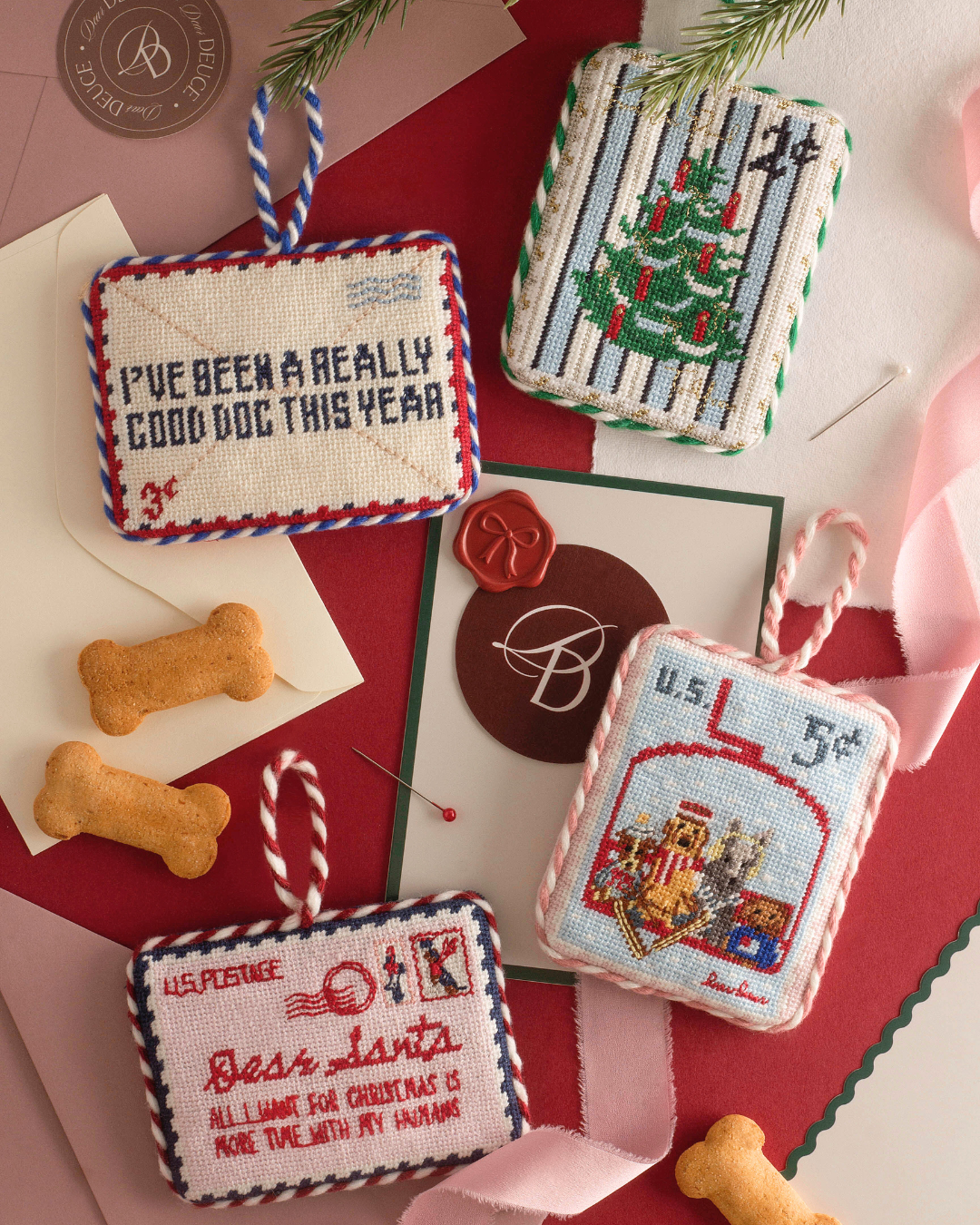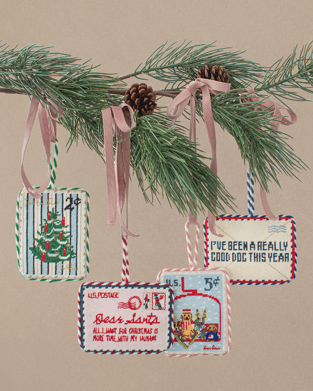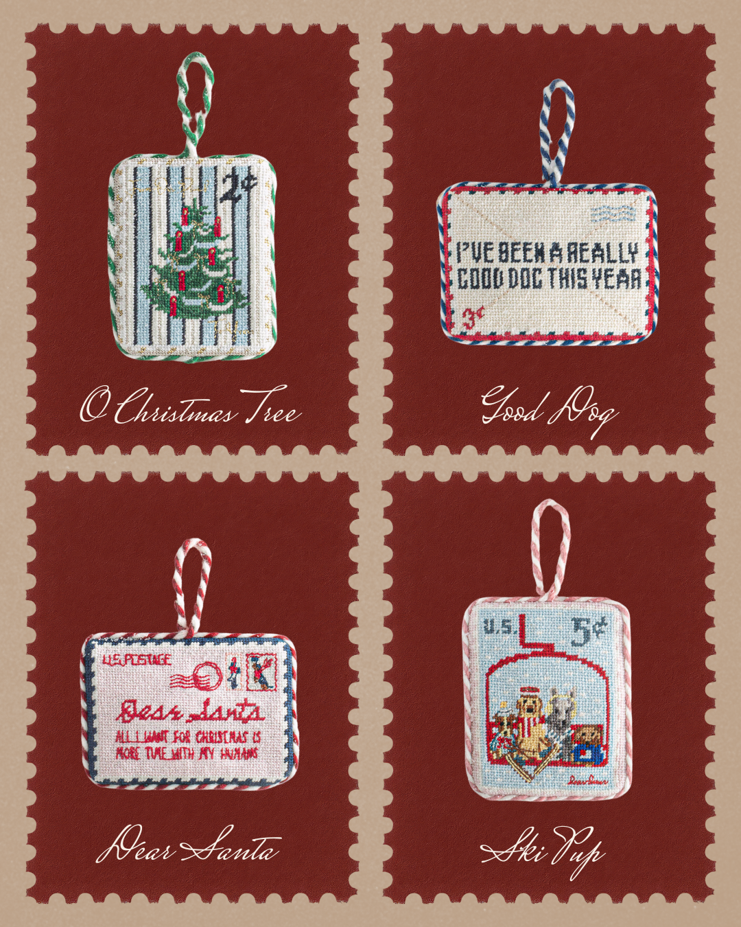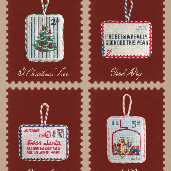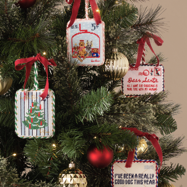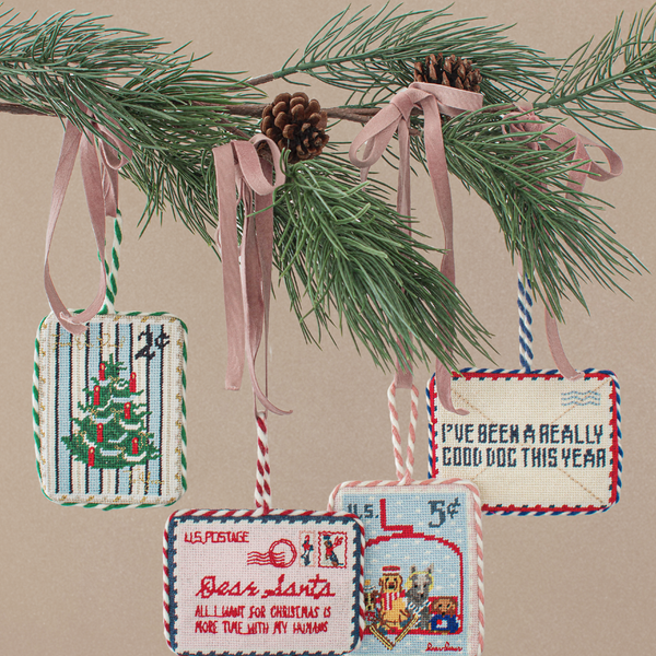 Inspired by vintage postage stamps, our needlepoint ornaments carry a charming message, a festive scene, and a tribute to our dogs, who make the holiday season even fuller. Arrives ready to gift.
