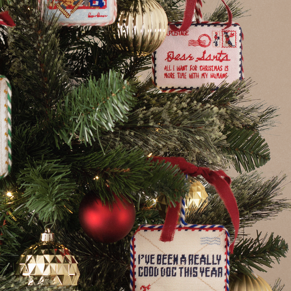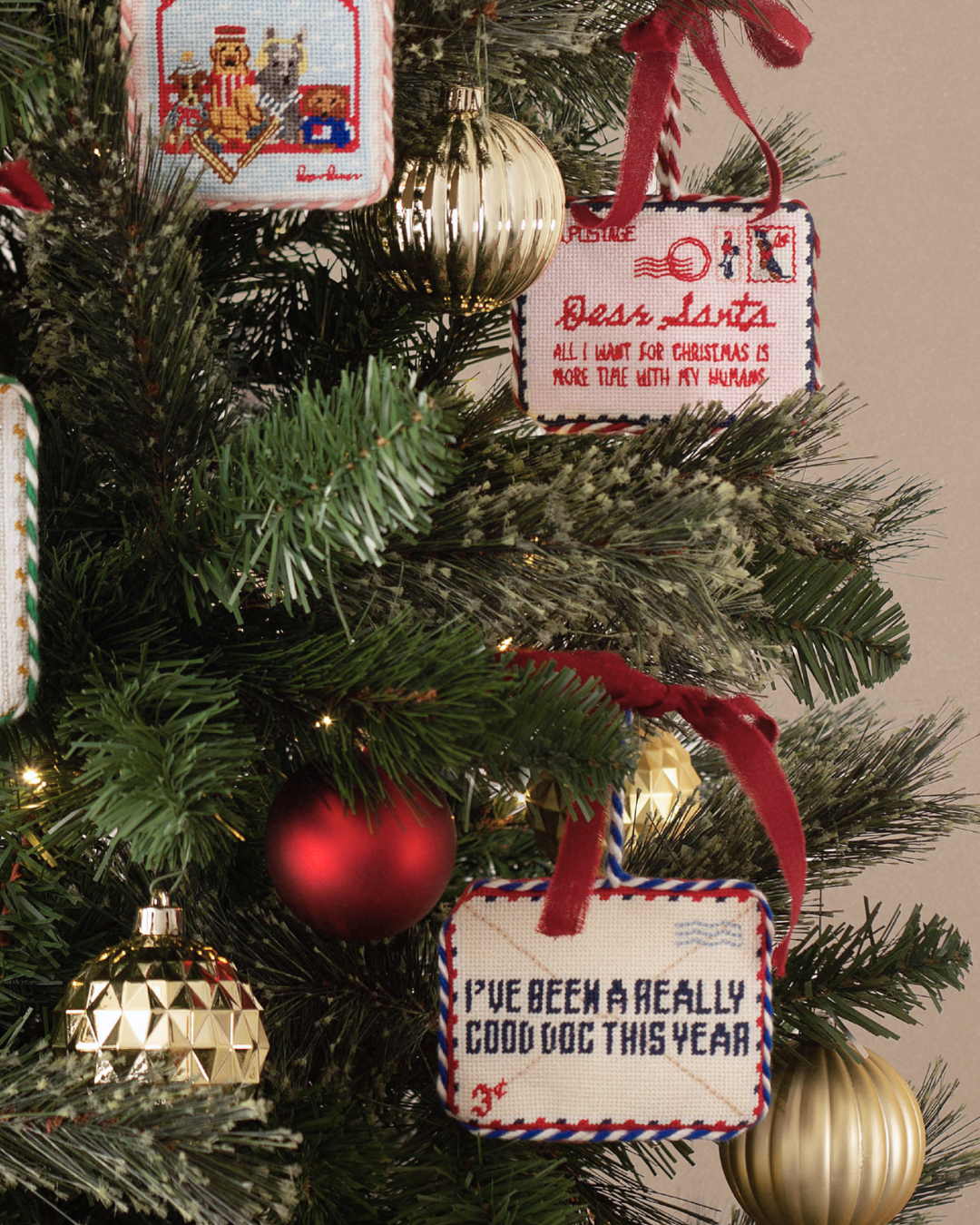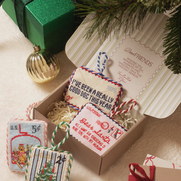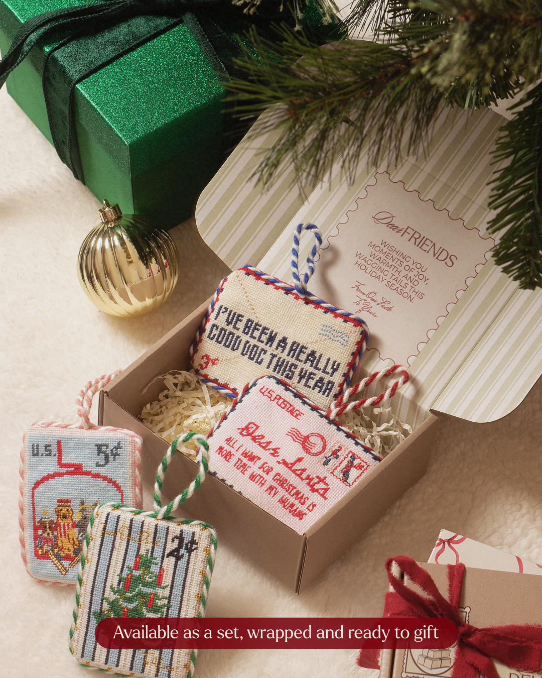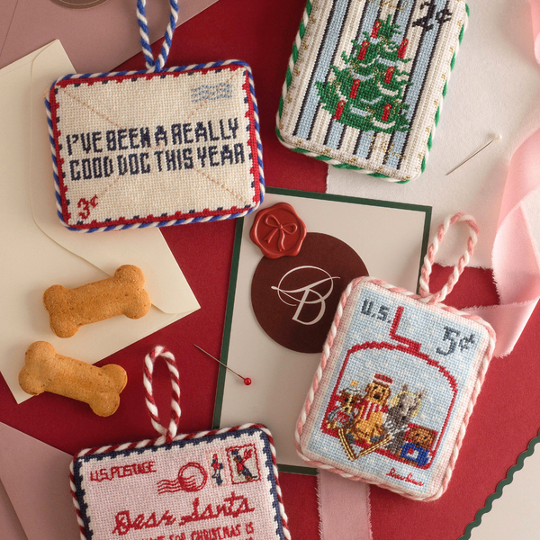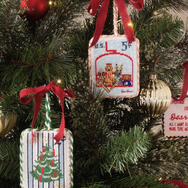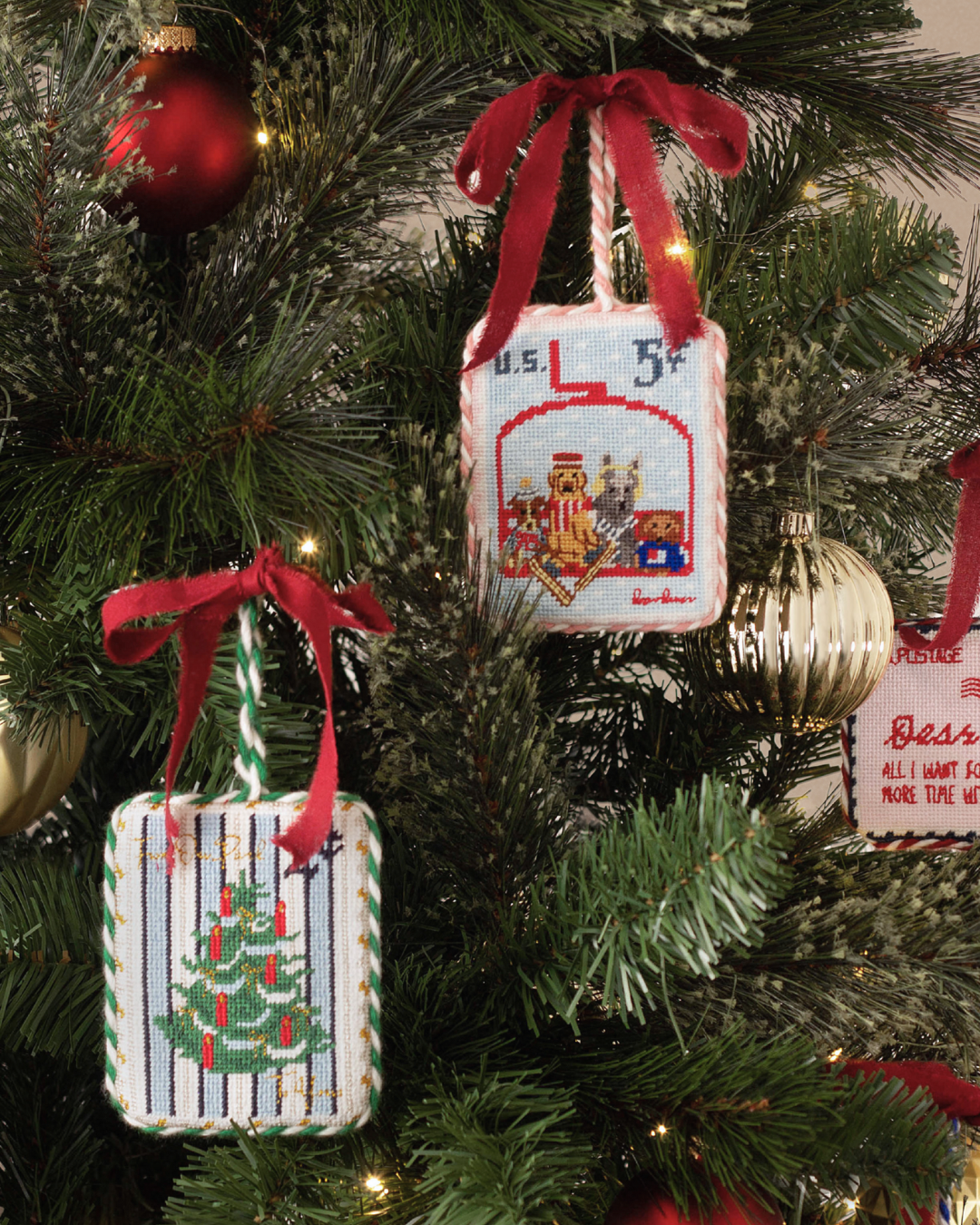 Inspired by vintage postage stamps, each needlepoint ornament carries a charming message, a festive scene, and a tribute to our dogs, who make the holiday season even fuller. Collect your favorite or start a new tradition.